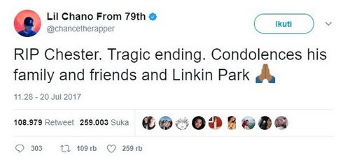 Rapper, penulis lagu, dan produser rekaman Chance The Rapper, mengungkapkan duka yang mendalam atas kematian tragis yang menimpa Chester Bennington.