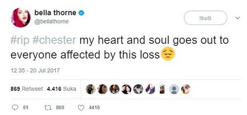 Penyanyi sekaligus aktris yang dikenal perannya dalam serial Disney "Shake it Up", Bella Thorne, turut sedih dan terpukul atas berita kematian Chester Bennington.