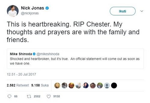 Penyanyi yang mempopulerkan lagu "Jealous", Nick Jonas, turut sedih atas kematian Chester Bennington. Dia pun mendoakan dan berharap keluarga yang ditinggalkan diberi ketabahan.