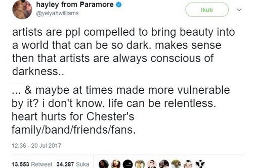 Vokalis band Paramore, Hayley Williams, mengungkap bahwa seniman bisa memiliki sisi gelap, dan mungkin Chester Bennington dibuat rentan oleh itu. Ia pun menyampaikan belasungkawa untuk keluarga, band, teman, dan para penggemar Chester.