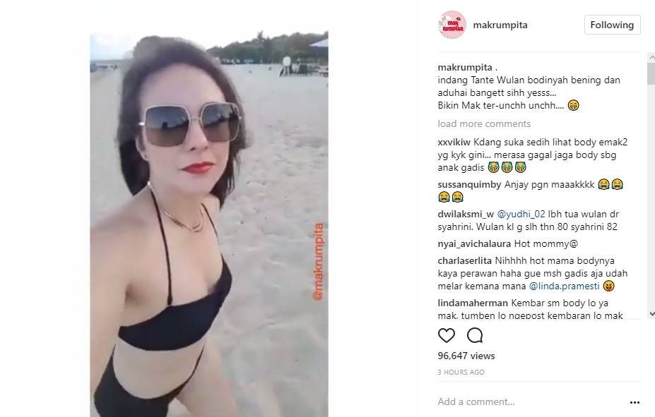Umur boleh bertambah, namun kecantikan dan kemolekan tubuh Wulan seolah tak luntur oleh waktu. Bahkan, bentuk tubuhnya pun masih terlihat seperti anak gadisnya. Bahkan, Wulan Guritno juga tak maku mengenakan bikini seksi yang menampilkan lekuk tubuhnya.