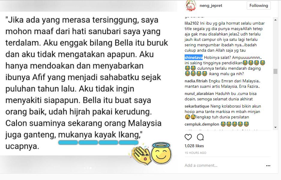 "Saya kan tidak menulis Bella buruk, saya hanya mengatakan 'Sabar ya lok, insyaallah diganti lebih baik,...aku enggak bilang Bella enggak baik. Itu bisa terjadi pada siapapun," katanya. "Kalau memang enggak jodoh, nanti ketemu pasangan baru yang mudah-mudahan unsur baiknya bisa klik."