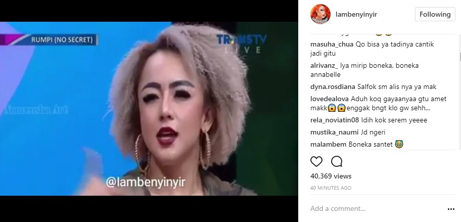 "@m_312_y kasiaann dia gagal bermetamorfosis..maunya jd boneka barbie malah jd boneka chuky say," tulis arum_cendana. "Mirip boneka chaky ya heheh," timpal riajayantii. "Anjayyy kyk nenek ny valak sumpah jelek banget.cantikan yg dulu ya olohhh ni orang mending punah aja deh," komentar cleocasya_n. "Mirip bgt sma boneka chaki ... tinggal ksh plester sma bekas jaitan," imbuh iepietch.
