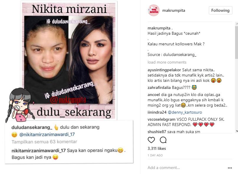 Mula-mula, salah satu akun di Instagram membandingkan wajah jadul Nikita Mirzani hingga kini. Perbedaan wajah selebritis yang akrab dipanggil Niki itu memang sangat kentara. Apalagi pada bagian hidung dan bibir.