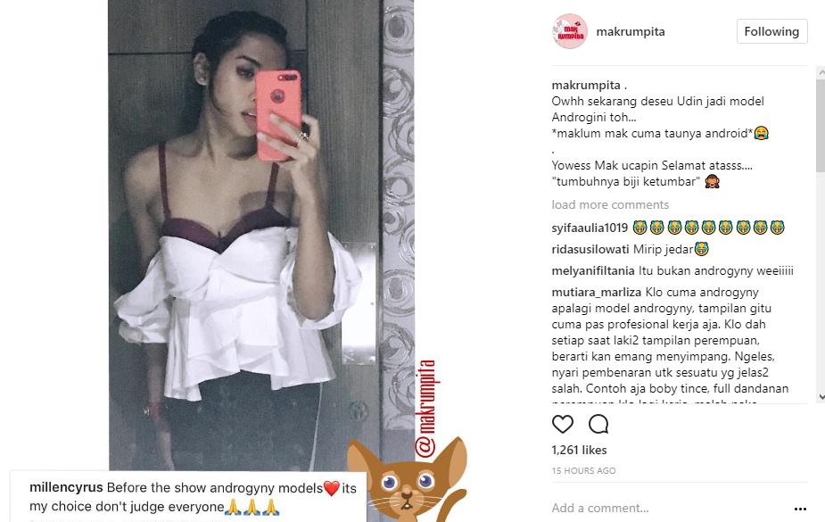 Mengetahui hal tersebut, tak sedikit netizen yang mengkritik pernyataan Millen sebagai model androgyny. "Please deh @millencyrus ! Andro tuh gak kaya lo. Even style cewek pake baju cowo or cowok pake baju cewek dalemnya normal nggak ngondek kaya becong. Belajar dulu sono pede gila lo labelin diri "model androgyny". Hell fuckin no," kritik netizen. "Android keleuuss androgyny kagak gitu. Model androgyny hari2 layaknya pria normal, lha ngana hari2 kekk ciwi ciwi kasihan ortu n keluarga nya, udh ngandani tp ndablek kyknya," kritik lainnya.