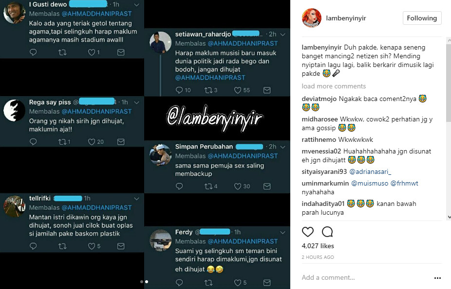 Mengetahui hal tersebut, tak sedikit netizen yang turut memberikan komentar nyinyir pada Ahmad Dhani. "Yang ngatain presiden anjing,jangan dihujat,pendidikannya stadium awal," sindir netizen. "Jangan dihujat, majklumin aja lg bingung gada job hehehe," sindir lainnya. "Pak de lg pengangguran, ide buntu, jualan cilok gak laku, kasihan dech lu," timpal lainnya.