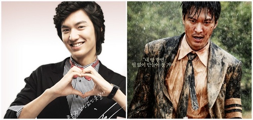 Foto di sebelah kanan adalah Lee Min Ho saat bermain di drama "Boys Before Flower". Ia masih memperlihatkan sisi imutnya. Penampilannya pun berubah seiring berjalannya waktu. Seperti yang tampak di foto sebelah kiri, saat ia memainkan peran di film "Gangnam Blues". Lebih gagah dan macho.