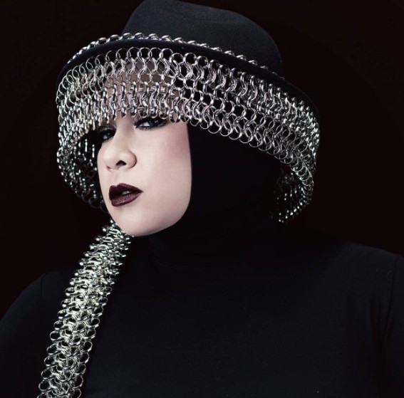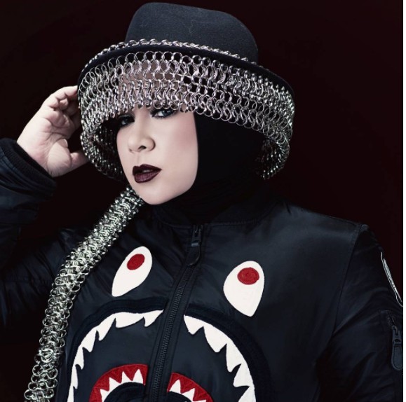 Selanjutnya ia juga mengenakan headpiece dengan banyak hiasan logam menyerupai topi hingga separuh wajahnya, kreatif banget!