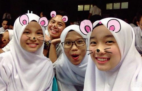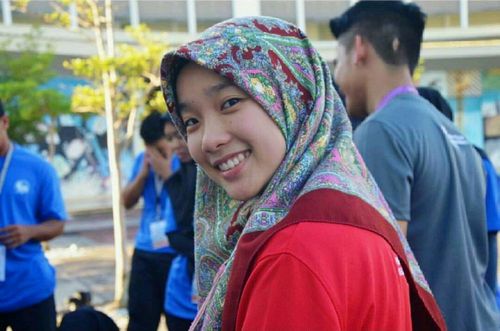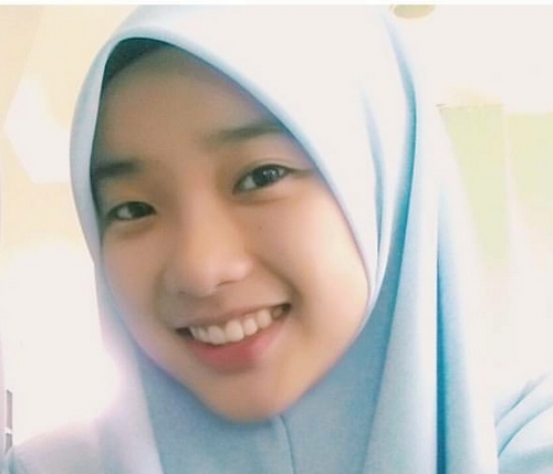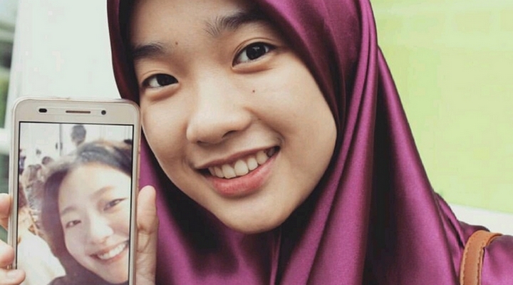 Amy Hani saat berfoto dengan teman-temannya di sekolah. Kecantikannya begitu terpancar meski dibalut hijab.