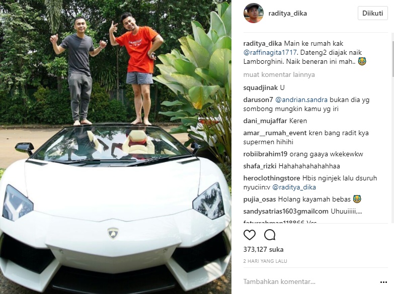 "Main ke rumah kak @raffinagita1717," tulis Raditya Dika dalam caption Instagramnya. "Dateng2 diajak naik Lamborghini. Naik beneran ini mah.."