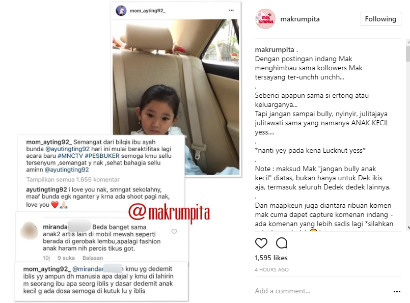 Netizen pun ikut merasa gerap dengan komentar pedas yang dinilai telah membully anak kecil. "Ga suka sama orang tuanya silakan aja. Tapi nge bully anak kecil yang engga ada dosa dan engga ada urusan sama haters itu namanya low life bangetv," kata netizen. "Ini mah yg komen aja kelewatan. Anak kecil dihina, ngga punya otak -_-," kata lainnya.