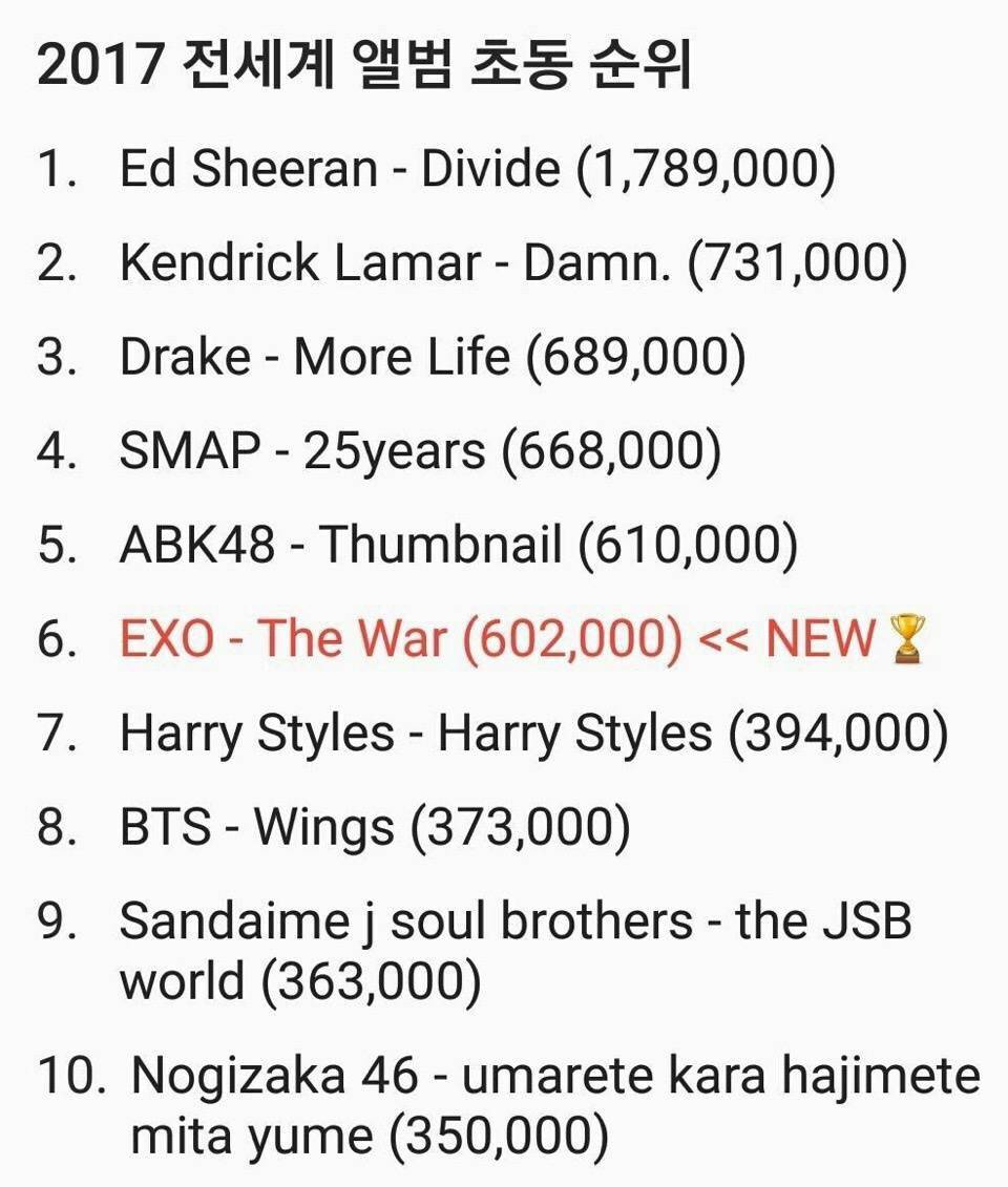 Baru-baru ini, boyband besutan SM Entertainment itu juga telah memecahkan rekor yang telah mereka pegang sebelumnya di chart Billboard 200. Mereka berhasil menampati posisi ke-87 dengan album "The War", dan mengalahkan kedudukan untuk album "Exodus" yang menduduki posisi ke-95 pada tahun 2015 lalu.