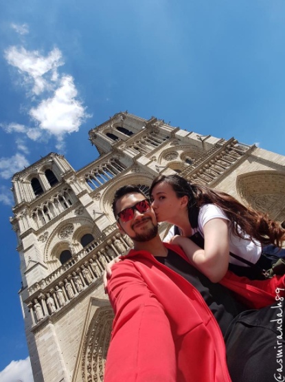 Jonas pasti seneng banget nih dapat kecupan mesra dari istri di bawah bangunan ikonik di kawasan Notre Dame.