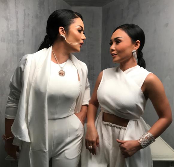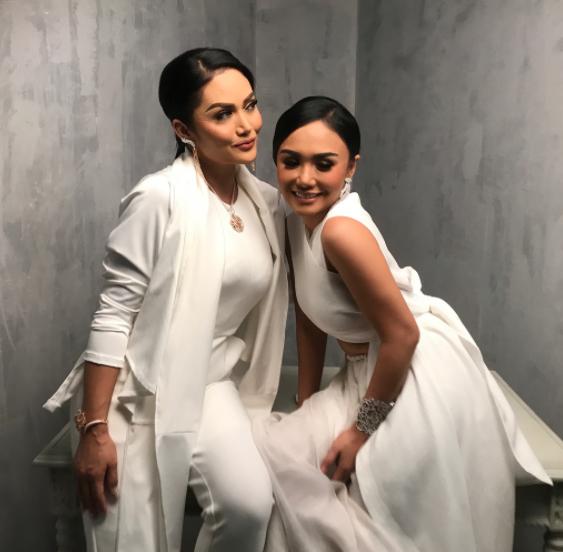 Bermodel rambut serupa dengan kuncir ke belakang, baik Krisdayanti maupun Yuni Shara sama-sama kompak berpose datar.