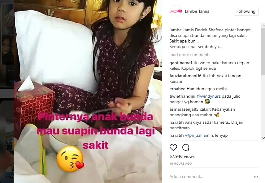 Sambil menatap ke arah kamera, Safeea terlihat tak canggung menyendokkan bubur dan memberikannya pada Mulan Jameela. "Pinternya anak bunda mau suapin bunda lagi sakit," tulis Mulan Jemeela dalam keterangan postingannya.