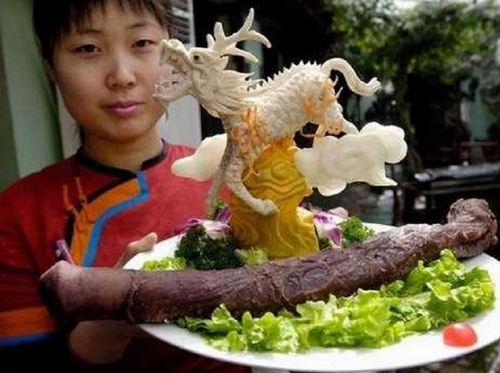 Yak penis atau penis lembu ini dimasak dengan minyak dan cabai. Makanan aneh dan mengerikan ini ada di sebuah restoran di Tiongkok yang khusus menjual masakan penis dan testis. Disebut-sebut makanan ini diresepkan pada pria berusia lanjut untuk mengembalikan kekuatan seksual.