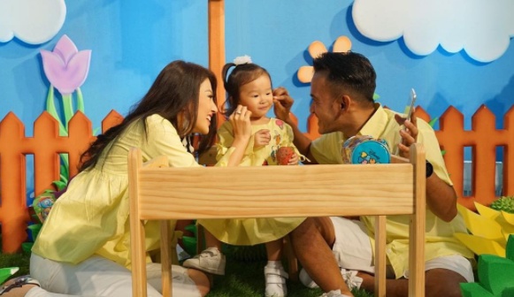 Pasangan muda Gilang Dirgahari dan sang istri kompak mengenakan busana berwarna kuning demi menghibur Thalia Putri Onsu tuh.