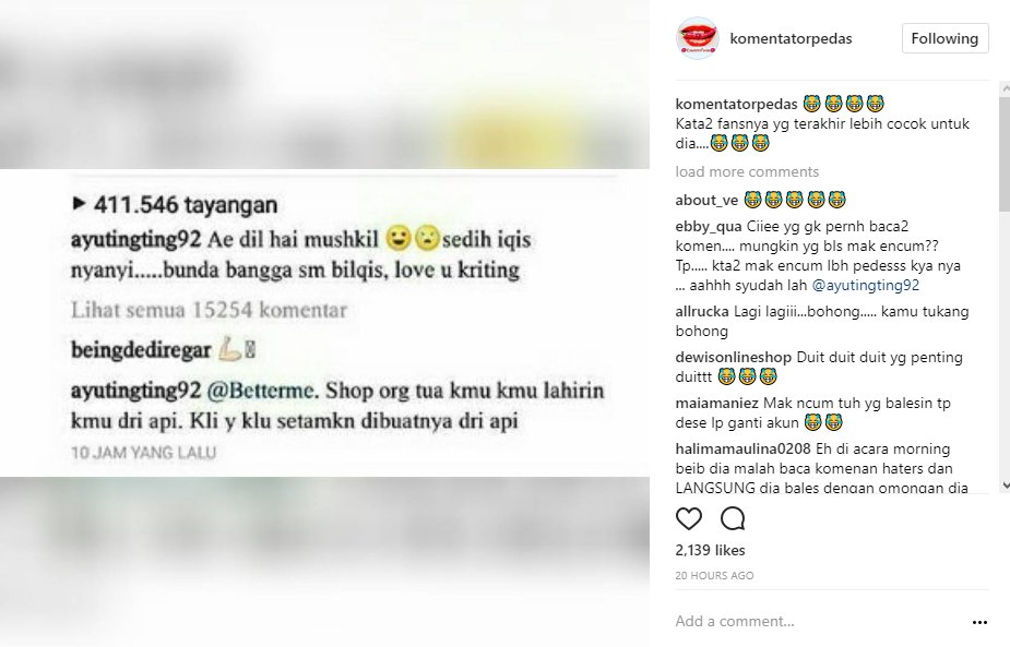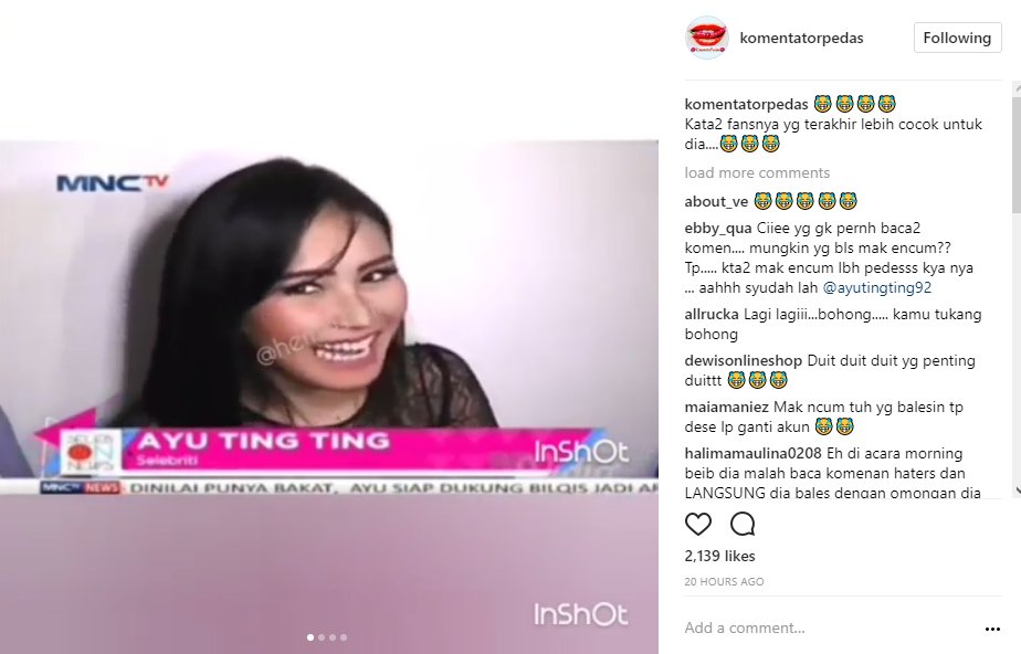 Cuplikan video yang diunggah ulang oleh akun @komentatorpedas itu pun berhasil mencuri perhatian. Bahkan, jawaban Ayu Ting Ting dianggap tak benar. Pasalnya, akun itu menyebut Ayu Ting Ting sempat membalas komentar haters yang menghina putrinya, Bilqis Khumaira Razak. Bukan hanya sekali, namun beberapa kali balasan komentar Ayu itu berhasil di screenshoot.