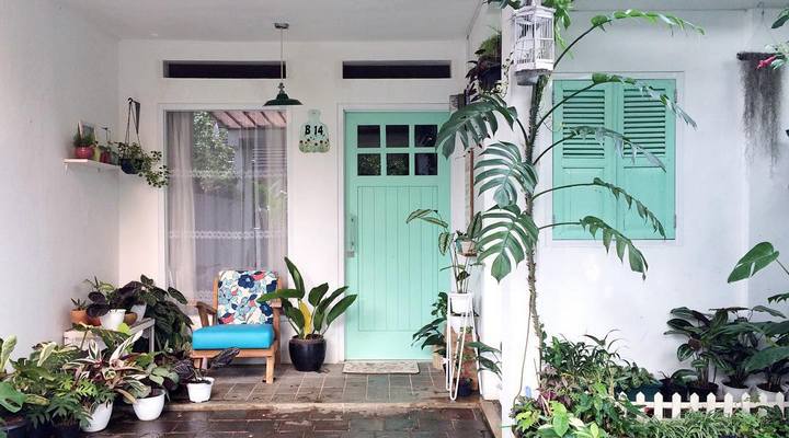 Meski tak punya taman atau halaman depan rumah. Kamu bisa menaruh tanaman hias atau tanaman merambat di teras rumah. Kalau perlu, tambahkan kursi santai custom dan lampu gantung minimalis.