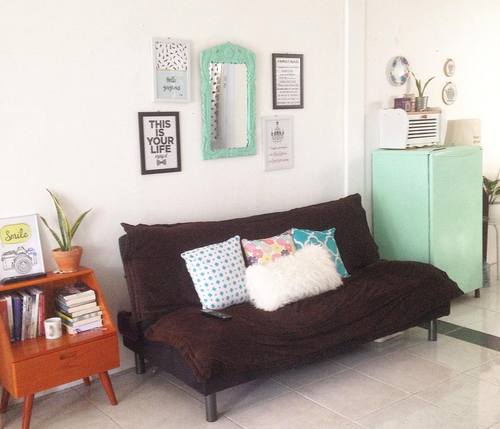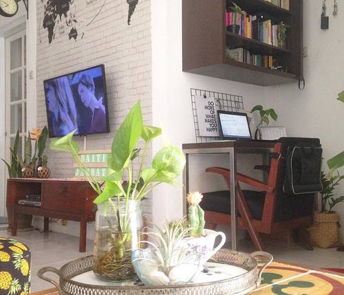 Ruang tamu menjadi ruang paling vital dalam rumah. Sebab kesan pertama akan muncul dari sini ketika tamu berkunjung ke rumahmu. Untuk memberi kesan vintage kamu bisa menghias sofamu dengan bantal-bantal lucu, dan memberi pot kecil berisi tanaman di meja tamu.
