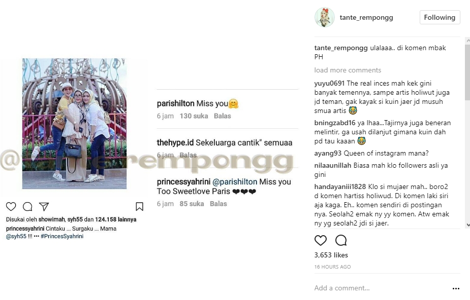 Berbagai komentar yang dilayangkan netizen mengetahui postingan Syahrini itu. Namun, rupanya seorang selebritis Hollywood, Paris Hilton juga ikut mengomentari unggahan foto Syahrini itu. Bahkan, komentar Paris seolah memperlihatkan kearabannya dengan sang pelantun "Sesuatu". "Miss you," tulis Paris dalam komentar Syahrini.