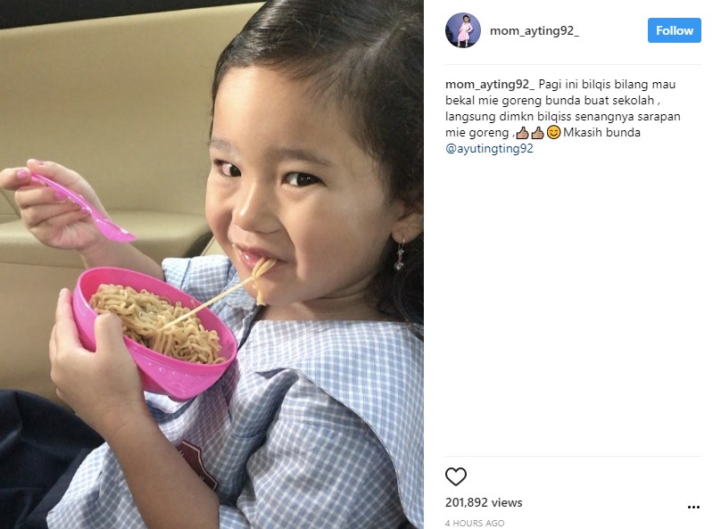 Melalui postingan Ibu Ayu Ting Ting, Umi Kalsum, terlihat Bilqis sangat menikmati menu sarapan karya sang bunda. Putri kecl buah pernikahan Ayu Ting Ting dan mantan suaminya, Enji itu terlihat makan tanpa disuapi oleh sang nenek.
