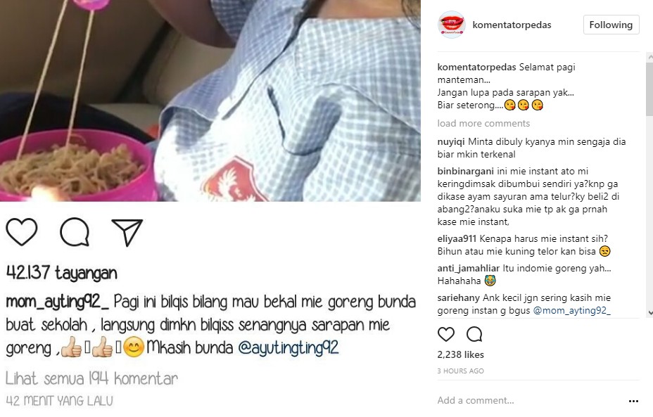 Mereka bahkan menyindir lantaran menu sarapan Bilqis yang disiapkan Ayu Ting Ting. "Masih anak2 koq di kasih mie goreng yaa... Gedhe2 kyk emaknya kebanyakan nelen micin..." sindir netizen. "Perasaan mie mulu tiap posting mknn iqis..." sindir lainnya. "Generasi miccin," timpal lainnya.