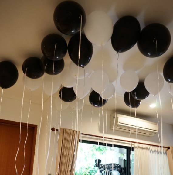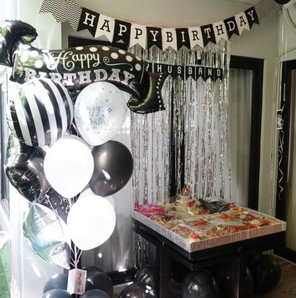Rini mendekor rumahnya dengan balon berwarna hitam dan putih serta menghiasinya dengan bunting flag bertuliskan "Happy Birthday My Husband".