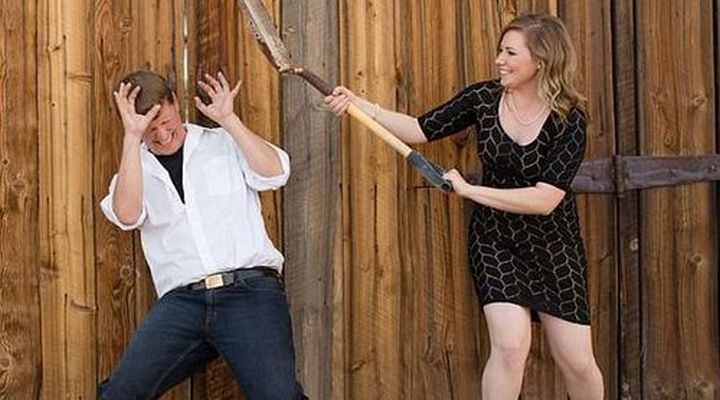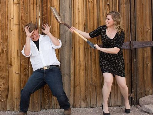 Foto pre-wedding ini terkesan aneh. Memperlihatkan kekerasan yang dilakukan wanita terhadap pasangannya. Lihat bagaimana si wanita memegang sekop lalu seolah akan memukulkannya ke pasangannya. Begitupun respon si pria yang seolah ketakutan karena hendak dipukul.