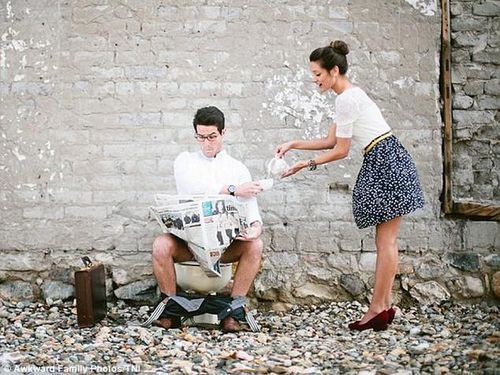 Si wanita menuangkan kopi ke cangkir yang dipegang pasangannya. Sementara pasangannya sedang duduk di toilet sambil membaca koran dengan serius. Ini bisa dibilang foto pre-wedding teraneh yang pernah ada, sebab si pria benar-benar membuka celananya seperti benar-benar berada di toilet.
