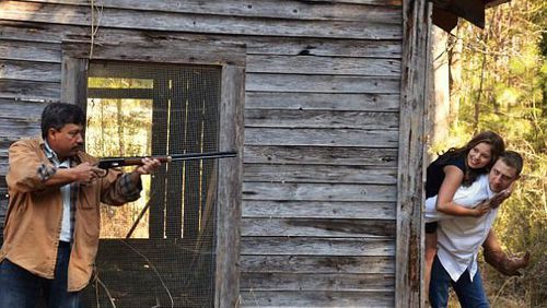 Foto pre-wedding yang aneh. Bukan momen romantis berdua, pasangan ini malah berfoto dengan pria yang memegang senapan dan mengarah padanya. Ini seolah memperlihatkan kalau hubungan cinta mereka mendapat ancaman, tidak direstui orang tua mungkin.