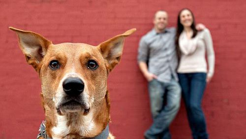 Kebanyakan orang difoto dengan background yang blur dan fokus pada dirinya. Namun, foto pre-wedding ini malah kebalikannya. Memperlihatkan fokus pada anjing, dan pasangan berada di belakang dengan kondisi blur.