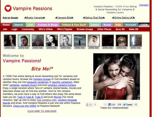 vampirepassions.com memfasilitasi para penggila hal-hal berbau vampir atau drakula. Banyak vampir-vampir mulai amatir sampai senior di sini. Membernya bisa saling bertukar cerita, membahas film, membahas supranatural, sampai berkencan.