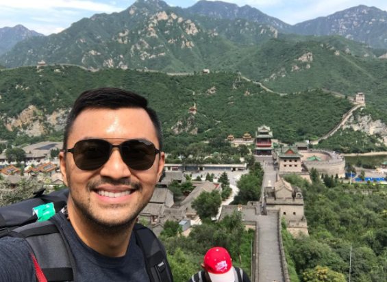 Usai tegang dengan pertandingan, waktunya relaksasi ke Tembok Besar Cina nih. Tetap kece di umur yang tak lagi muda, Anjasmara tampan dengan kacamata hitam.
