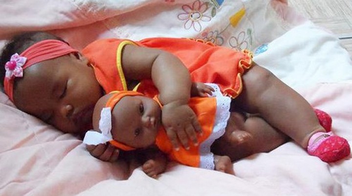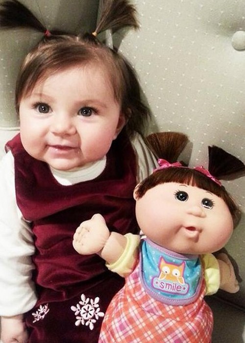 Seolah anak kembar, bayi-bayi menggemaskan ini didandani sangat mirip dengan boneka mainannya.