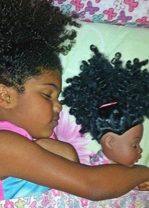 Balita ini seolah jelmaan dari si boneka. Tak hanya rambut keritingnya yang begitu mirip. Kulitnya juga sama-sama berwarna kecoklatan. Lucu dan menggemaskan ya..