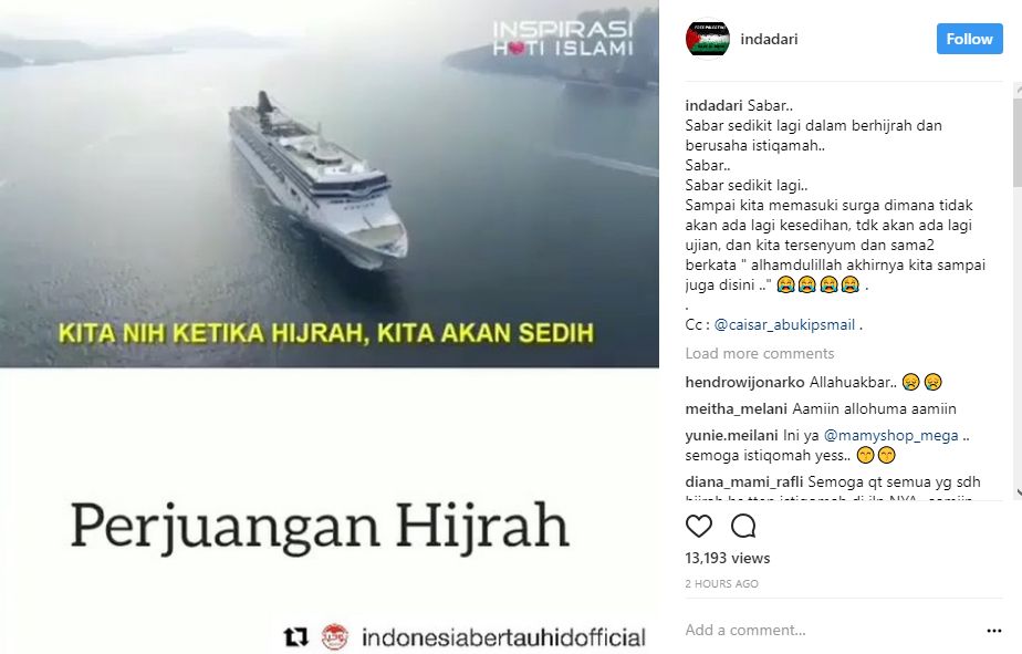 Dalam postingan tersebut, Indadari seolah memberi semangat pada sang suami untuk tetap istiqomah dalam berhijrah. "Sabar.. Sabar sedikit lagi dalam berhijrah dan berusaha istiqamah..Sabar..Sabar sedikit lagi..Sampai kita memasuki surga dimana tidak akan ada lagi kesedihan, tdk akan ada lagi ujian, dan kita tersenyum dan sama2 berkata " alhamdulillah akhirnya kita sampai juga disini .." Cc : @caisar_abukipsmail," tulis Indadari dalam caption postingannya sambil menambahkan emoji menangis.