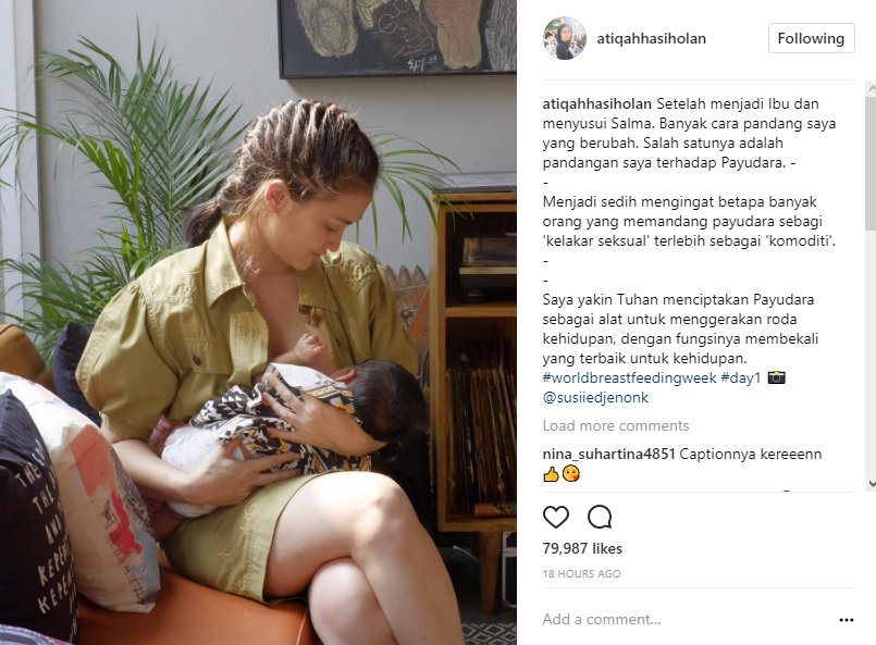 Belum lama ini, Atiqah membagikan fotonya bersama sang putri yang tengah disusui melalui akun Instagram pribadinya, @atiqahhasiholan. Tak hanya itu, Atiqah juga mencoba mengubah pola pikir masyarakat tentang payudara. Apalagi, saat itu bertepatan dengan minggu menyusui sedunia.