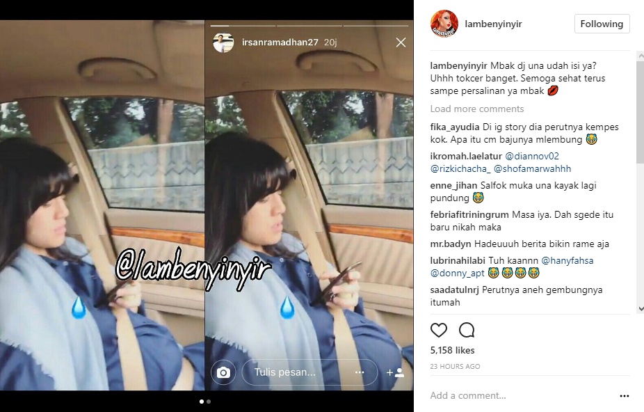 Bagaimana tidak, belum genap 1 bulan menikah, Dj Una dikabarkan tengah berbadan dua. Hal ini diketahui melalui perubahan perut Una yang kian membesar. "Mbak dj una udah isi ya? Uhhh tokcer banget. Semoga sehat terus sampe persalinan ya mbak," tulis akun gosip @lambenyinyir dalam caption postingannya.