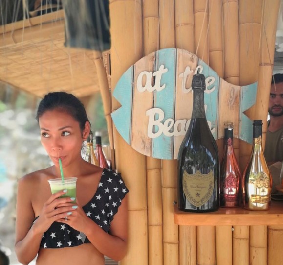 Seusai puas mengeksplor pantai, ia mampir untuk minum sebentar di Cala Cap Falco. Bikininya lucu banget kan?