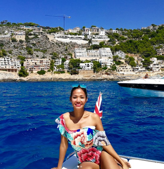 Sambil mengenakan bikini one piece beraksen bunga dilengkapi kacamata besar, Shanty seru-seruan menaiki yacht dan berpose seksi ditengah laut biru.