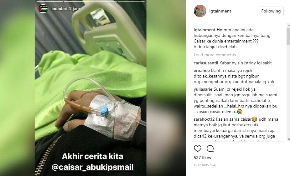 Seperti diketahui, belum lama ini sang Istri memang tengah terbaring sakit. Bahkan, Indadari terlihat tak rela saat sang suami kembali ke panggung hiburan. "Akhir cerita kita @caisar_abukipsmail," tulis Indadari dalam keterangan postingannya yang diunggah ulang oleh akun gosip @igtainment.