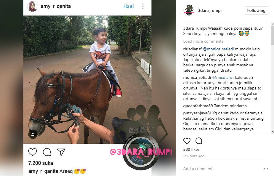 Namun, rupanya hal tersebut malah membuat netizen melayangkan kritikan lantaran Amy Qanita tak membagikan foto Rafathar saat menunggang kuda poninya. "Punya rafathar juga.... duuuh... foto rafathar naik aja belom liat ijk," kata netizen melalui kolom komentar akun gosip @3dara_rumpi. "Gk malu apa ya..itu kuda kan pemberian dari tieta buat rafathar cucu nya tieta, laah ini ama sesebesan nya malah d naikin ama cucu dari anak kandungnya yg gk ada hbngn apa2 sma keluarga tieta, bukannya malah ngasih kado juga buat cucunya tpi malah manfaatin," kata lainnya. "itu kan punya rafathar," timpal lainnya.