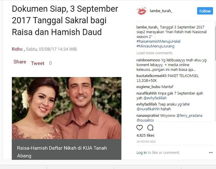 Kanal247.com - Hari Patah Hati Nasional akan kembali terjadi, karena tanggal pernikahan Raisa dan Hamish Daud telah terungkap dan menjadi viral. Hal ini diketahui dari postingan berbagai akun gosip Indonesia. Salah satunya adalah lambe_turah_. Sama seperti akun gosip lainnya, lambe_turah_ mengungkapkan bahwa tanggal pernikahan Raisa telah banyak diketahui oleh umum.