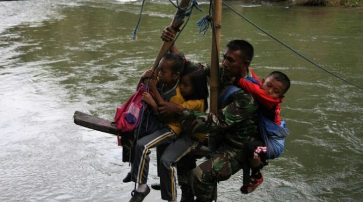 Salah satunya seperti ditunjukkan dalam potret yang viral belakangan ini. Dalam foto yang beredar luas itu tampak seorang anggota Tentara Nasional Indonesia (TNI) tengah membantu anak-anak mnyeberangi sungai demi menuju sekolahnya.