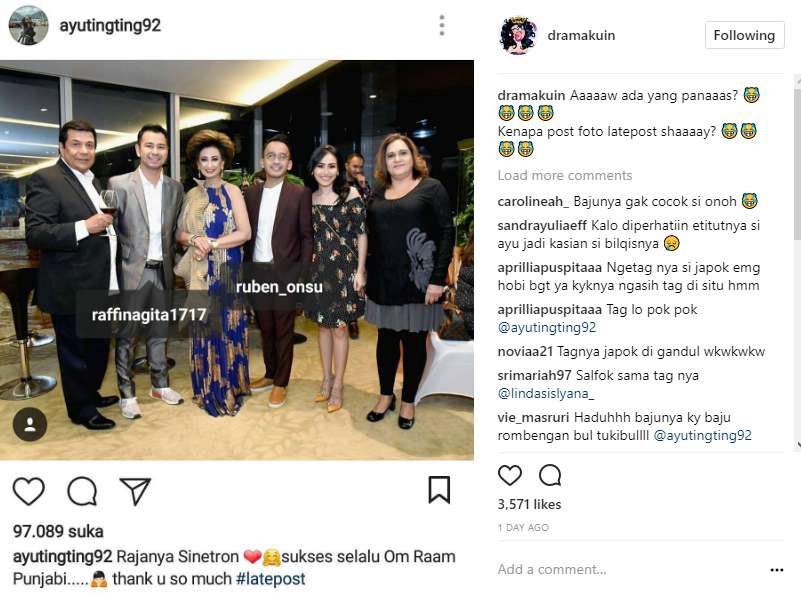 Tak hanya berdua, Ayu Ting Ting juga tengah bersama Raffi Ahmad, Ruben Onsu dan dua wanita dewasa lain. "Rajanya Sinetron sukses selalu Om Raam Punjabi..... thank u so much #latepost," tulis Ayu Ting Ting dalam caption postingannya.