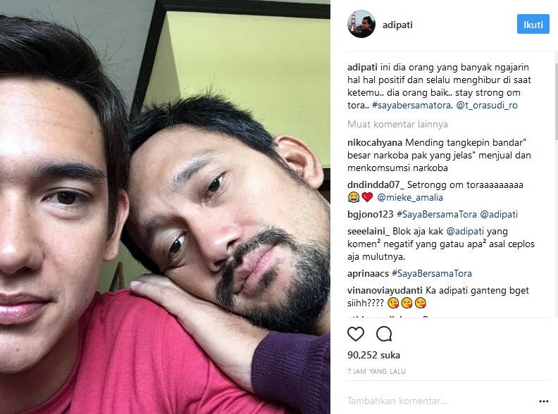 Adipati Dolken mengunggah fotonya saat ia bersama Tora Sudiro sebagai bentuk dukungan. Baginya, Tora adalah sosok penghibur yang selalu mengajarkan hal-hal positif bagi orang disekitarnya termasuk dirinya, tak ayal #sayabersamatora pun 'nangkring' di keterangan foto Adipati.