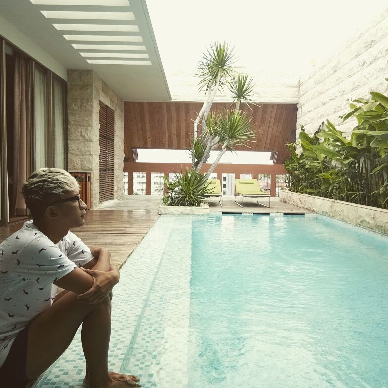 Tiba di Bali, Aming memilih menginap di TS Suites Leisure, Seminyak Bali. Ini rutinitas hariannya saat di hotel, bersantai di pinggir kolam renang.