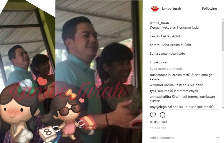 Kabarnya, foto tersebut diambil ketika Ardina Rasti sedang makan soto bersama Arie. "Ketemu Mba Ardina di Solo. Sama sama makan soto," tulis akun @lambe_turah dalam caption postingannya.