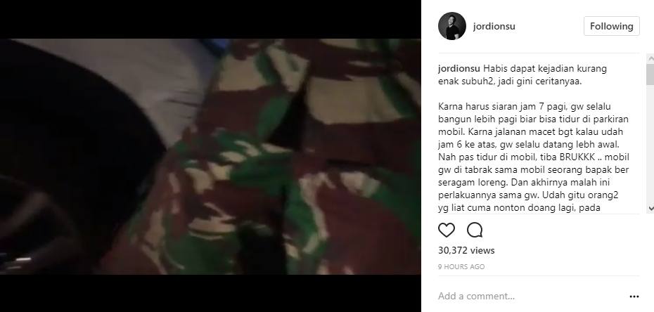 Namun, tiba-tiba Jordi yang tengah terlelap dikejutkan dengan suara hantaman cukup keras pada mobilnya. Rupanya, mobilnya itu ditabrak oleh seseorang. "Nah pas tidur di mobil, tiba BRUKKK .. mobil gw di tabrak sama mobil seorang bapak ber seragam loreng," imbuhnya.